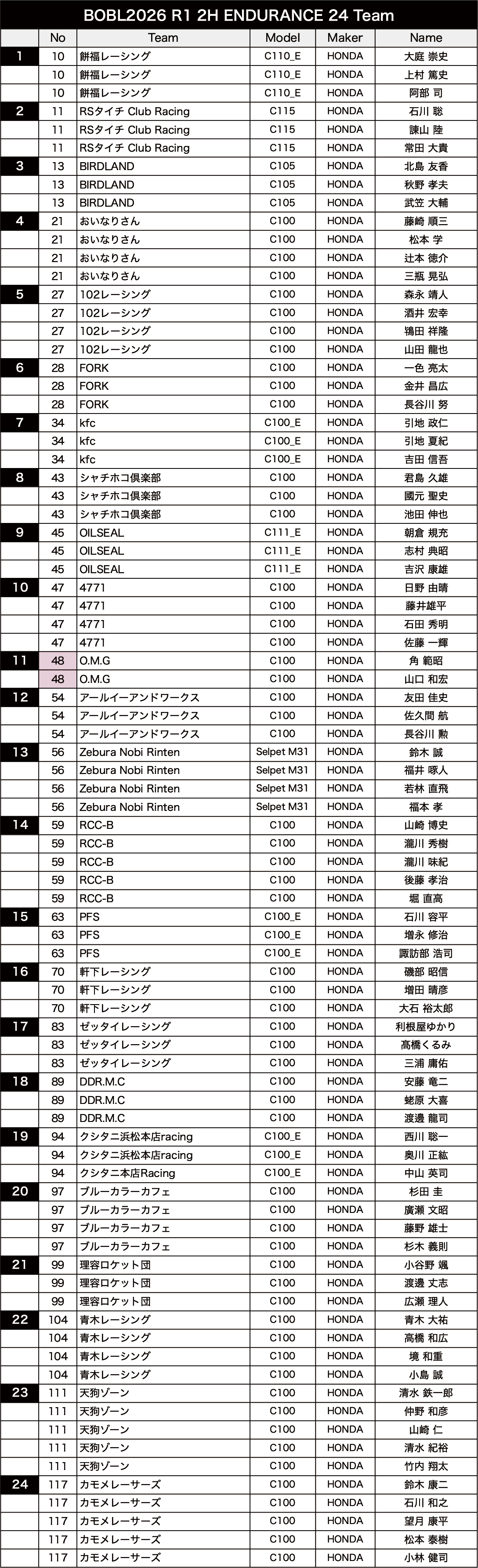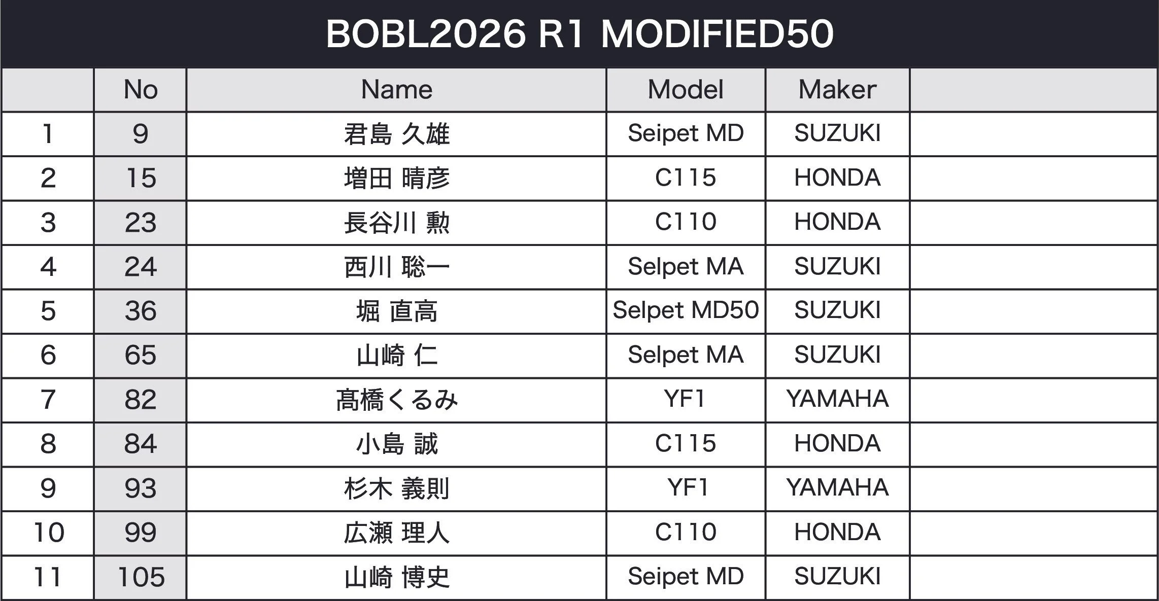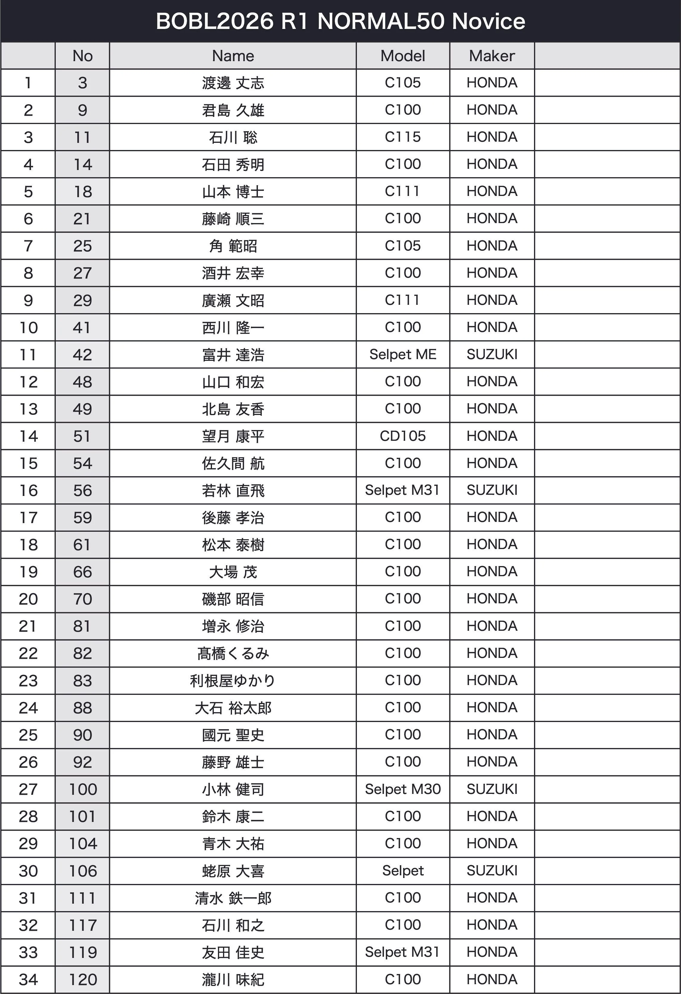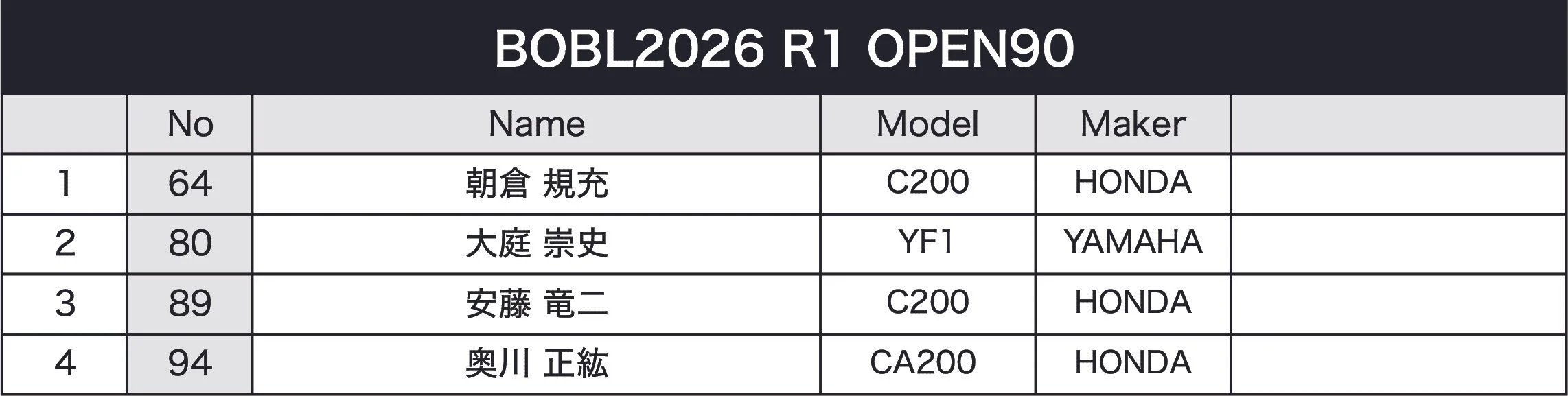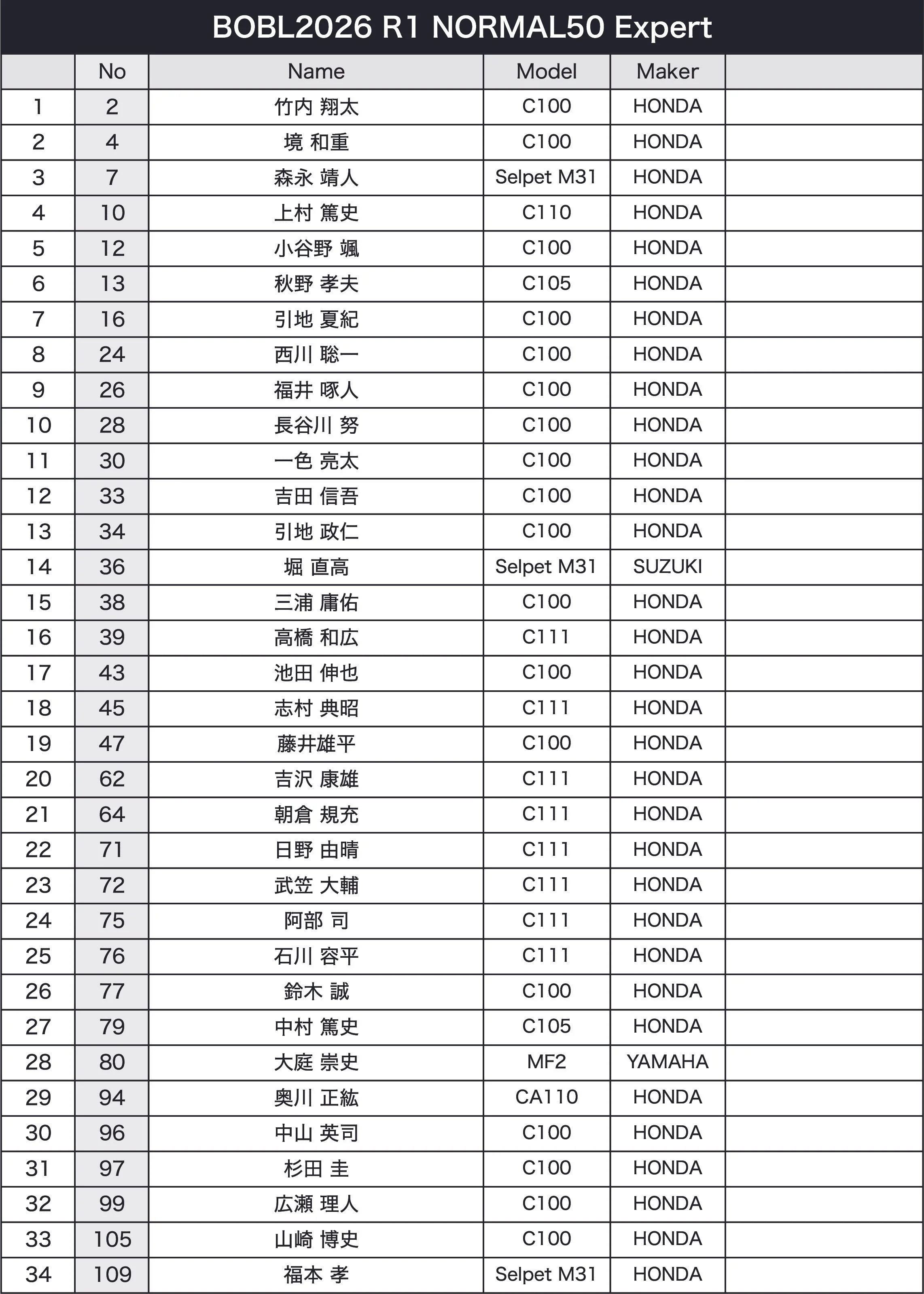 BOBL Photo March 25, 2026 B.O.B.L. 2026 R1 BOBL Photo March 25, 2026 SHIRAITO SPEEDLANDN50 Expert N50 Novice Modified 50/Open90 2H EnduRance
